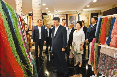 習(xí)近平和彭麗媛走進(jìn)波依卡揚(yáng)建筑群旁的一家地毯和絲綢作坊。紡織女工們正在制作布哈拉傳統(tǒng)手工地毯,用嫻熟的技藝織成色彩斑斕的圖案。 王滬寧、栗戰(zhàn)書、楊潔篪等陪同參觀。 |