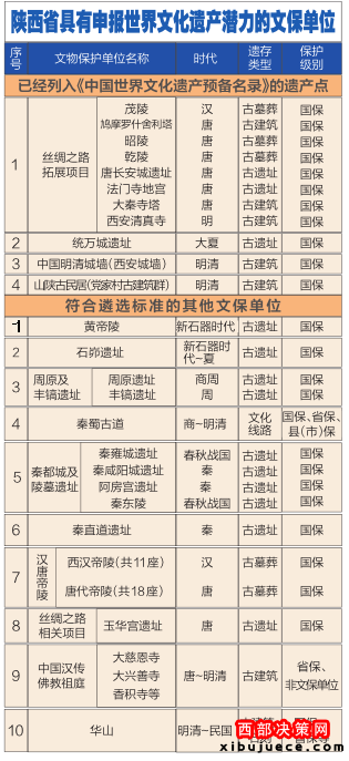 《中國世界文化遺產預備名單》約5年更新一次,最近一次更新是2012年11月。目前陜西有4處遺址被列入,分別為絲綢之路拓展項目、統(tǒng)萬城遺址、中國明清城墻(西安城墻)、山陜古民居(黨家村古建筑群)。