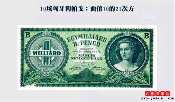 匈牙利帕戈在第二次世界大戰(zhàn)后失去價(jià)值,遭受到紀(jì)錄上有史以來最嚴(yán)重的貨幣貶值,物價(jià)飛漲到了無法控制的地步,計(jì)價(jià)時(shí)需要用到極高的位數(shù),面值10垓帕戈的鈔票,舊匈牙利的鈔票,面值是100,000,000,000,000,000,000,也就是10的21次方帕戈(可能紙幣上實(shí)在放不下這么多0,所以面額是用文字表示的)。