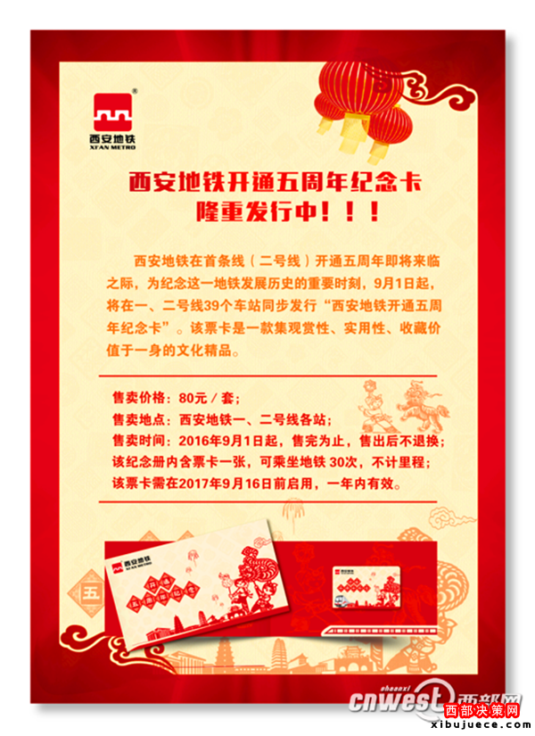 9月1日起,西安地鐵將在一、二號線39座車站同步發(fā)行“西安地鐵開通5周年紀念卡”,售價80元。