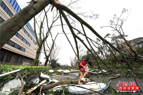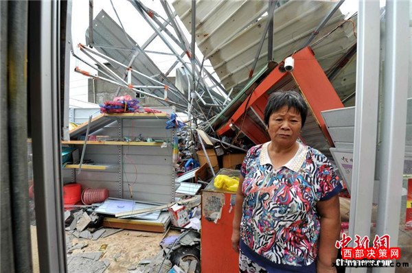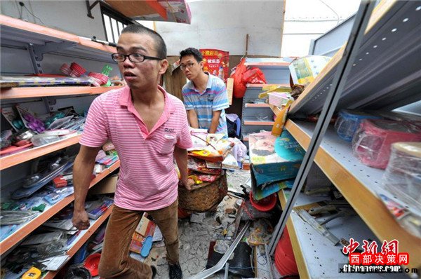 9月15日,今年第14號臺風(fēng)“莫蘭蒂”于凌晨3時05分在廈門翔安區(qū)沿海登陸,登陸時中心附近最大風(fēng)力15級(48米/秒,強臺風(fēng)級),中心氣壓945百帕,給翔安當(dāng)?shù)貛韲?yán)重?fù)p失。圖為翔安一超市被摧毀。