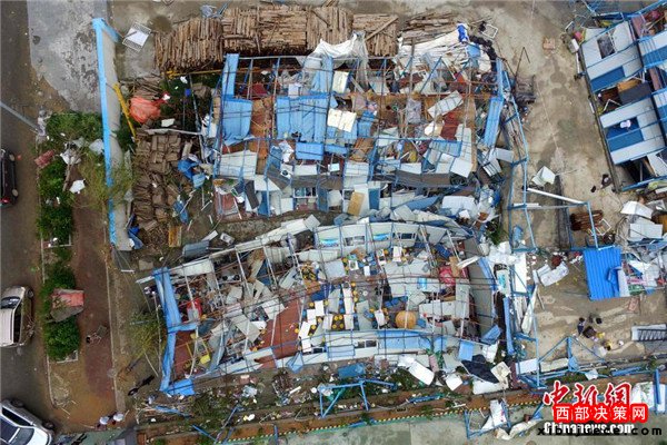 9月15日,今年第14號臺風(fēng)“莫蘭蒂”于凌晨3時05分在廈門翔安沿海登陸,登陸時中心附近最大風(fēng)力15級(48米/秒,強臺風(fēng)級),中心氣壓945百帕。圖為航拍登陸點翔安一工地工棚被完全摧毀。
