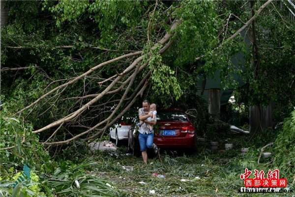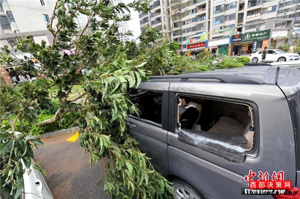 9月15日,今年第14號臺風(fēng)“莫蘭蒂”于凌晨3時05分在廈門翔安沿海登陸,登陸時中心附近最大風(fēng)力15級(48米/秒,強臺風(fēng)級),中心氣壓945百帕。圖為廈門市區(qū)大批車輛被吹倒的樹木損壞。