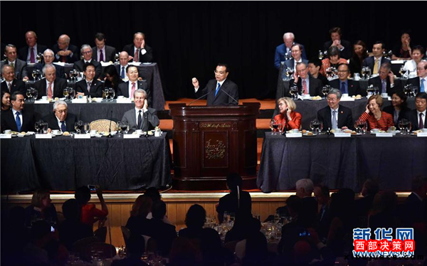 李克強出席紐約經濟俱樂部舉行的歡迎宴會并致辭和回答提問