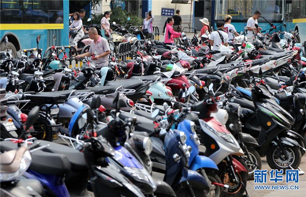 10月11日,市民在廣西南寧市街頭一個停車場存取電動自行車。