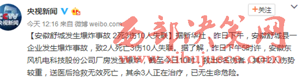 新聞中心官方微博今日消息稱,據新華社,昨日下午,安徽舒城縣一企業(yè)發(fā)生爆炸事故,致2人死亡3傷10人失聯。據了解,昨日下午5時許,安徽東風機電科技股份公司廠房發(fā)生爆炸,截至今日10時,救出5名傷者,其中2人傷勢較重,送醫(yī)后搶救無效死亡,其余3人正在治療,已無生命危險。