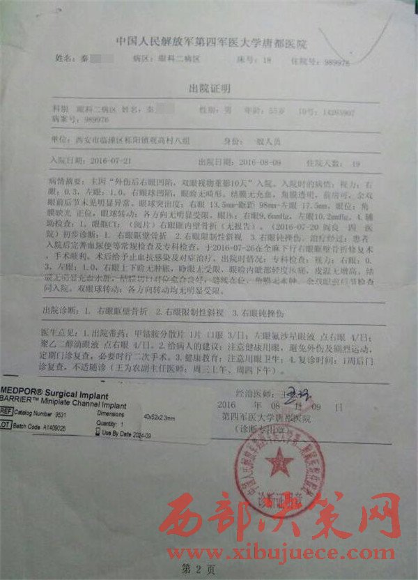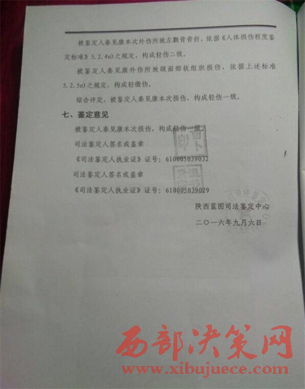秦見康的出院證明和陜西藍(lán)圖司法鑒定中心的鑒定結(jié)果。秦見康供圖秦見康向澎湃新聞提供的中國(guó)人民解放軍第四軍醫(yī)大學(xué)唐都醫(yī)院的出院證明顯示,秦見康7月21日住院,8月9日出院,醫(yī)院診斷結(jié)果顯示其右眼眶壁骨折,右眼限制性斜視,右眼鈍挫傷。陜西藍(lán)圖司法鑒定中心的鑒定結(jié)果顯示,秦見康構(gòu)成輕傷一級(jí)。