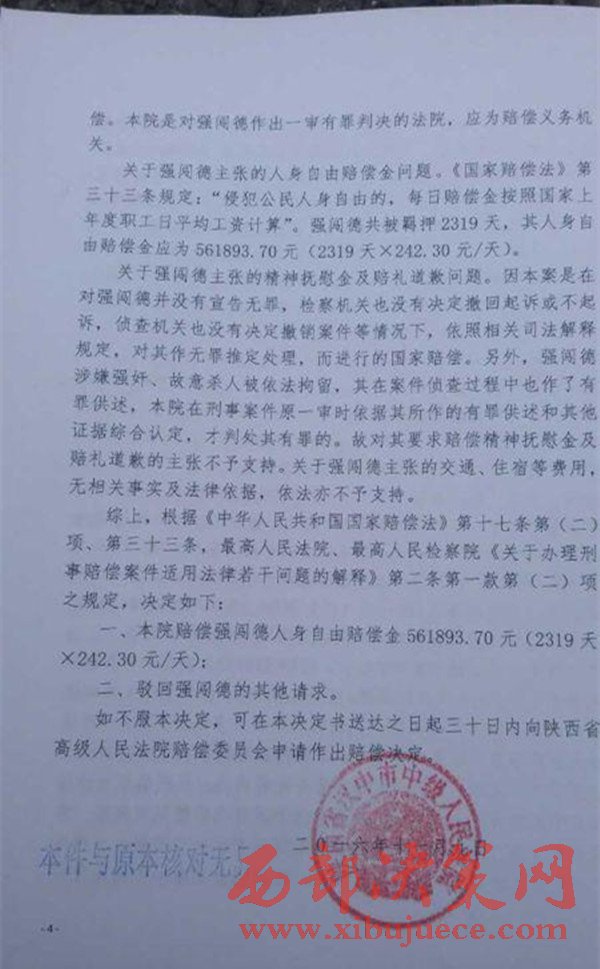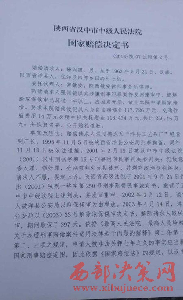 2016年11月9日,陜西省漢中市中級(jí)人民法院作出國(guó)家賠償決定,國(guó)家賠償書(shū)上說(shuō),根據(jù)《中華人民共和國(guó)國(guó)家賠償法》的有關(guān)規(guī)定,決定賠償強(qiáng)闖德561893.70元。(強(qiáng)闖德共被羈押2319天,每天按242.30元賠償)。而對(duì)于強(qiáng)闖德提出的交通、住宿等費(fèi)用,以及精神賠償?shù)纫?,不予支持?/span>