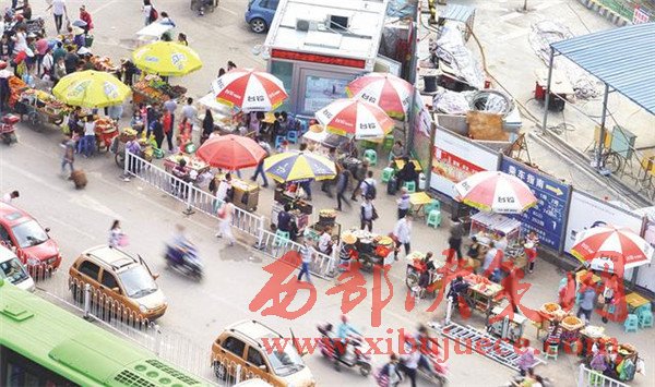 (沒有整治前。進(jìn)入火車站前的道路上,商販的推車構(gòu)成兩條直直的長(zhǎng)線。資料圖)