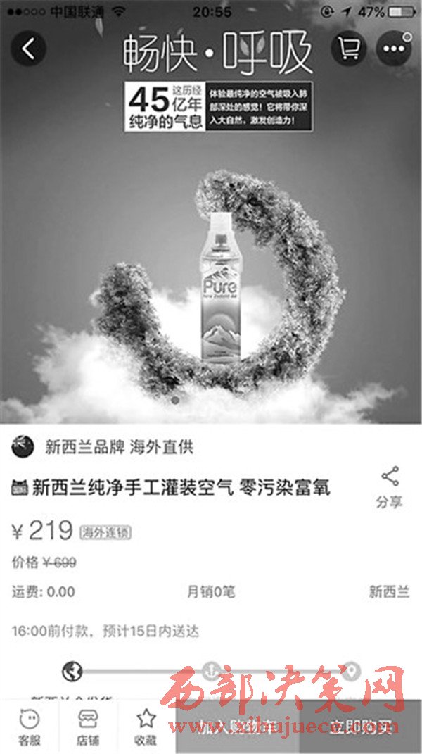 可一旦加上“進口”的標簽,價格就不一樣了。北青報記者搜索發(fā)現(xiàn),來自加拿大的名為“維他”的空氣標價為108元,為7.2L一瓶。而標稱“新西蘭純凈手工灌裝空氣,零污染富氧”,標價高達699元,折扣價為219元,規(guī)格為7.7L一瓶,按照產品說明可用180次左右,一口空氣的價格在1.2元左右。