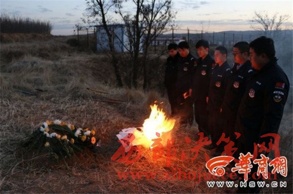 12月8日,府谷縣公安局警犬訓(xùn)導(dǎo)隊(duì)警犬“湯姆”在府谷縣新民鎮(zhèn)執(zhí)行安全隱患排查任務(wù)回到駐地進(jìn)食后出現(xiàn)腹部膨脹的狀況,經(jīng)犬醫(yī)醫(yī)治無(wú)效于當(dāng)晚死亡。12月9日,府谷縣公安局警犬訓(xùn)導(dǎo)隊(duì)警察為這個(gè)“特殊的戰(zhàn)友”舉行了簡(jiǎn)樸的葬禮,他們“愿無(wú)言的戰(zhàn)友,一路走好。”