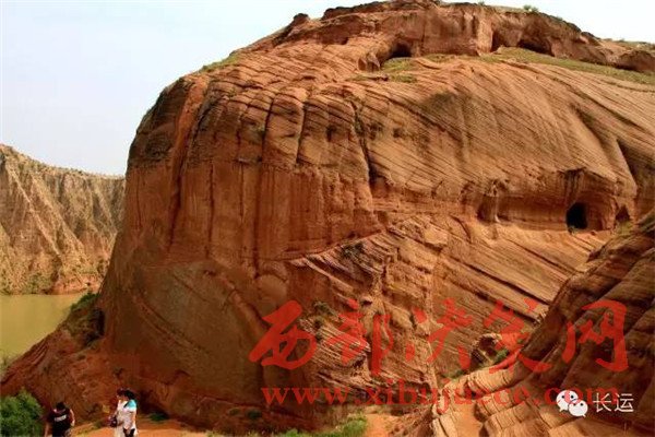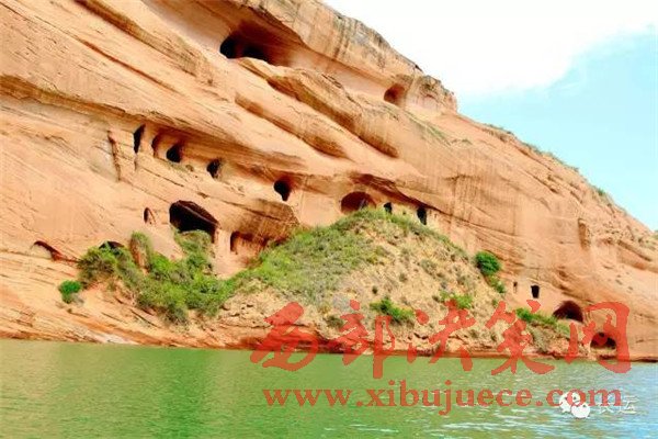 閆寨子,遠眺是快巨大的紅石頭,巋巍屹立,綠水環(huán)繞,可謂龍洲“赤壁”,離地面百米以上建有窯洞,上下三層,三十多間。