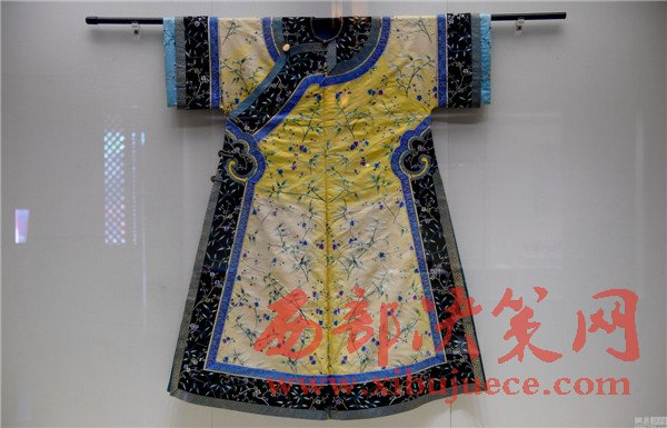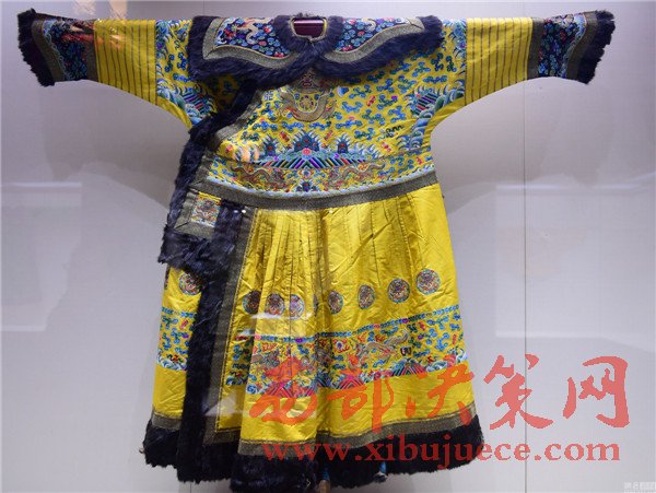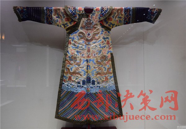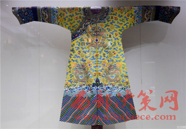 2017年01月05日,遼寧省沈陽市,沈陽故宮博物院舉行“錦繡華彩—院藏清宮織繡展”,清朝皇帝冬季朝袍首次亮相。沈陽故宮是中國僅存的兩大古代皇家宮殿建筑群之一,為清朝初期努爾哈赤和皇太極的宮殿,距今近400年歷史,貯藏近20萬件清宮御用物品和內府秘籍。清明黃江綢繡金龍出鋒夾朝袍。