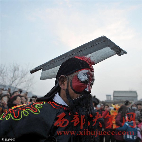 刀具化妝非常神速,一個人的化妝也就三五分鐘,很快就從棚子中走出進入表演現(xiàn)場。一名血社火傳承人介紹:“血社火的秘密就在化妝,而且我們歷來傳男不傳女,更不能隨便向外人透露”。