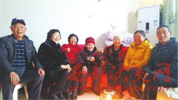 王奶奶一家人合影(從左至右分別是大女婿80歲、大女兒70歲、二女兒67歲、王奶奶92歲、親家母86歲)。