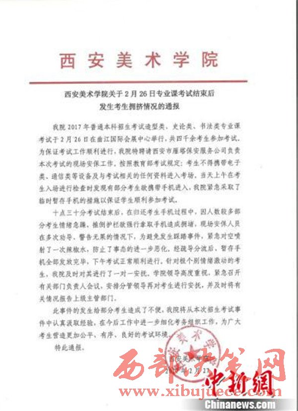 西安美術(shù)學(xué)院發(fā)布的事件通報(bào)稱,考試結(jié)束后,在歸還手機(jī)過(guò)程中,因人數(shù)較多部分考生情緒急躁,推倒護(hù)欄欲強(qiáng)行拿取手機(jī)造成擁堵,現(xiàn)場(chǎng)安保人員在多次勸導(dǎo)、警告無(wú)果的情況下,為避免發(fā)生踩踏時(shí)間,緊急對(duì)空噴射了一次辣椒水,防止了事態(tài)的進(jìn)一步惡化。經(jīng)疏導(dǎo)分流后,暫存手機(jī)全部發(fā)放完畢,下午考試順利進(jìn)行。針對(duì)個(gè)別情緒激動(dòng)的考生,該院即使對(duì)其進(jìn)行了一對(duì)一安撫。學(xué)院領(lǐng)導(dǎo)高度重視,緊急召開有關(guān)部門負(fù)責(zé)人會(huì)議,安排分管領(lǐng)導(dǎo)再對(duì)考生進(jìn)行安撫,并及時(shí)將有關(guān)情況報(bào)告上級(jí)主管部門。此事件的發(fā)生給部分考生造成了不便,該院將從本次招生考試事件中認(rèn)真汲取經(jīng)驗(yàn),在今后工作中進(jìn)一步細(xì)化考務(wù)組織工作,為廣大考生營(yíng)造更加公平、有序、良好的考試環(huán)境。