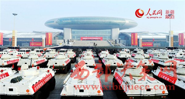 新疆國際會展中心廣場上,1萬余名武警官兵、公安民警、民兵預備役人員等各維穩(wěn)力量緊握鋼槍盾牌、整齊列隊挺立,直升機在空中盤旋,一輛輛軍車、裝甲車、摩托車列隊待發(fā)。
