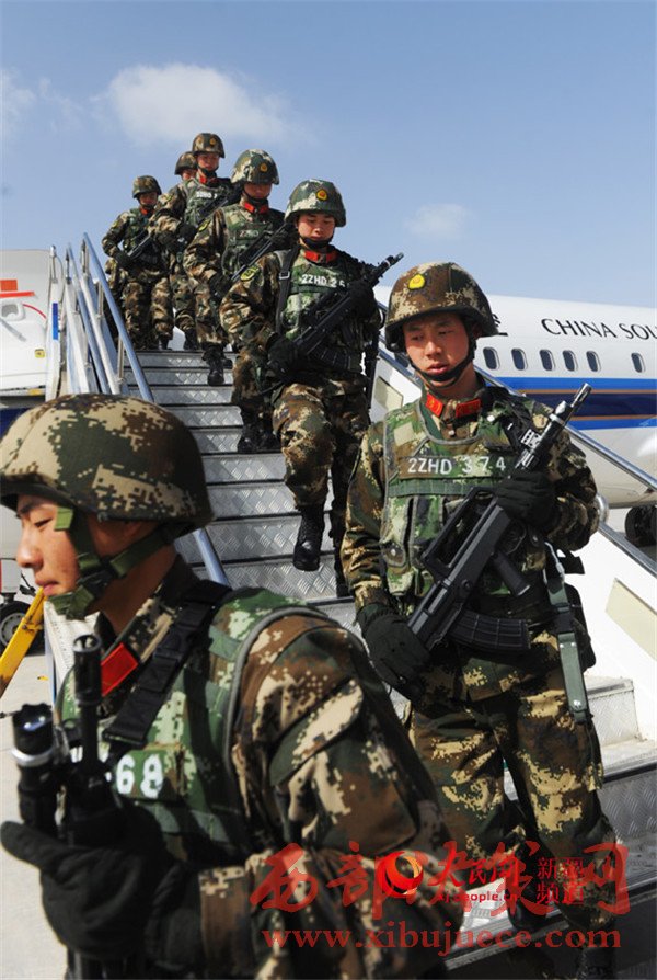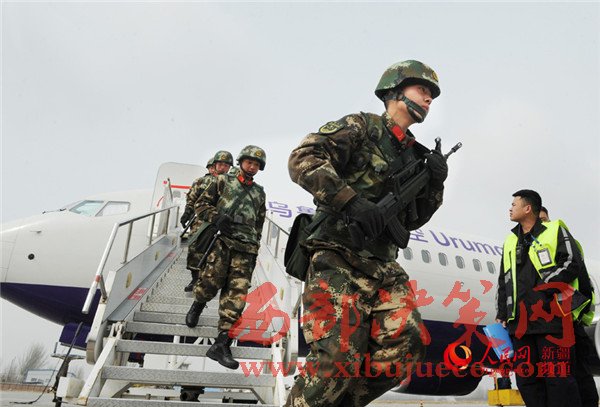 參加反恐維穩(wěn)誓師大會的武警官兵到達阿克蘇機場,向任務區(qū)進發(fā)。