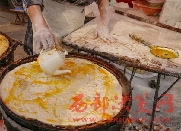 在餅上雙面澆油,熟透了以后會金黃金黃的。