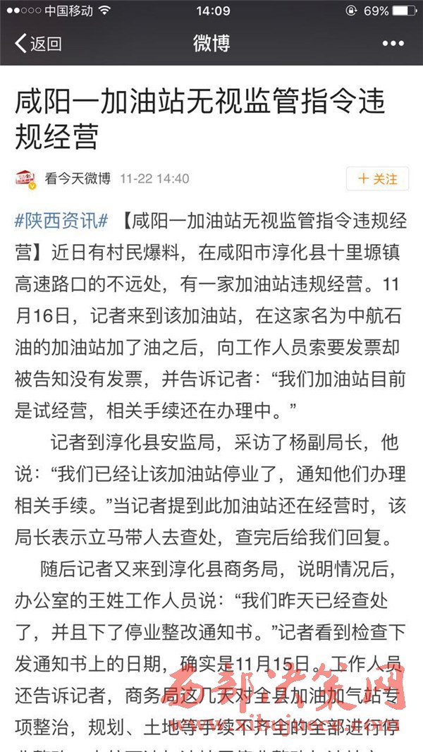 記者到淳化縣安監(jiān)局,采訪了楊副局長,他說:“我們已經(jīng)讓該加油站停業(yè)了,通知他們辦理相關(guān)手續(xù)。”當(dāng)記者提到此加油站還在經(jīng)營時,該局長表示立馬帶人去查處,查完后給我們回復(fù)。隨后記者又來到淳化縣商務(wù)局,說明情況后,辦公室的王姓工作人員說:“我們昨天已經(jīng)查處了,并且下了停業(yè)整改通知書。”記者看到檢查下發(fā)通知書上的日期,確實(shí)是11月15日。
