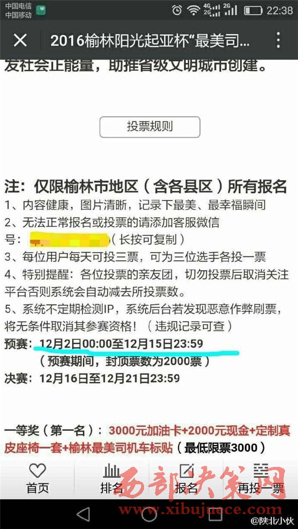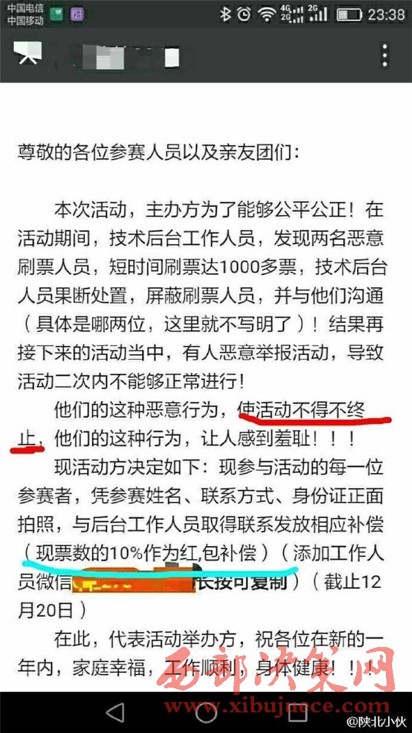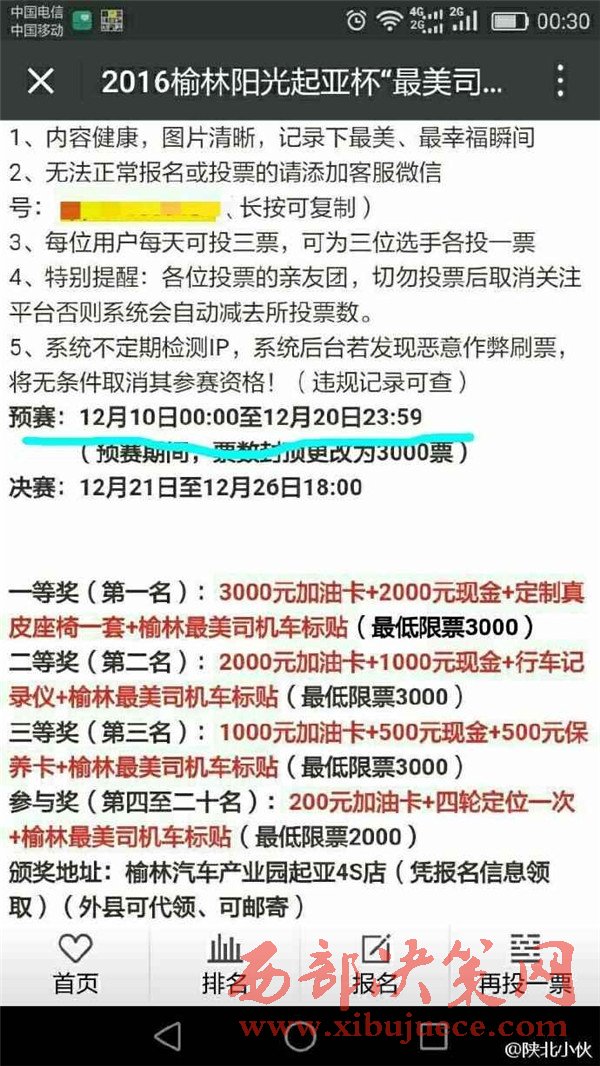2016年12月初,榆林陽光汽貿(mào)通過某公眾號發(fā)起2016榆林陽光起亞杯“最美司機”評選活動,活動設(shè)置了豐厚了獎品作為獎勵。并組織全民參與評選活動的投票行為。至此,在榆林眾多市民的朋友圈都發(fā)起了轉(zhuǎn)發(fā)拉票行為。然而,此次拉票行為卻不斷變更投票時間和決賽時間。近日,某公眾號發(fā)布信息,聲稱陽光汽貿(mào)組織的“最美司機”活動取消,并給予相應(yīng)的票數(shù)補償。此行為卻引起眾多市民的質(zhì)疑,認為陽光汽貿(mào)是在“消遣”參與投票的近萬名市民,從而變相成廣告推銷行為。究竟陽光汽貿(mào)是心疼評選活動的獎品發(fā)放,還是一種涉嫌商業(yè)的欺詐行為,請@榆林工商 ,根據(jù)《消費者權(quán)益保護法》予以重查重處。