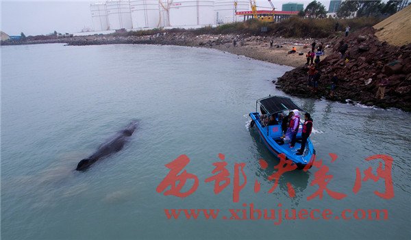 3月14日,在惠州港油庫(kù)碼頭附近海域,專家和工作人員查看游向淺灘的抹香鯨。