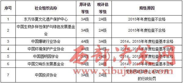 民政部14日發(fā)布公告,根據(jù)《社會組織評估管理辦法》第三十條關于獲得評估等級的社會組織有上年度年度檢查不合格、連續(xù)2年年度檢查基本合格或受相關政府部門行政處罰情形的,由民政部門作出降低評估等級處理的規(guī)定,決定對東方華夏文化遺產(chǎn)保護中心、中國生物多樣性保護與綠色發(fā)展基金會、中國爆破行業(yè)協(xié)會、中國環(huán)境保護產(chǎn)業(yè)協(xié)會、中國圓明園學會、中國交響樂發(fā)展基金會、中國投資協(xié)會等7家社會組織降低評估等級。