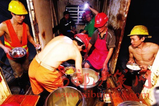 由于上下班路途較遠,工人們每個班要在隧洞內(nèi)工作18個小時左右。臨近中午,隧洞小火車送來了午飯。打開保溫桶,四菜一湯熱氣騰騰。兩葷兩素,米飯管飽,湯管夠。吃完飯,工人們又投入到了緊張的工作中去了,他們在期盼著把漢江水引到關中的那一天。