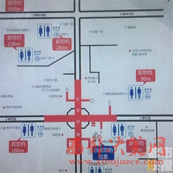 在這個指示牌的地圖上,除了標注出“所在位置”以及周邊的標志性地點,還醒目的標出了周圍的衛(wèi)生間地點。圖上標明,在小寨十字,周圍一共有七個可用衛(wèi)生間,最遠的一個距離280米,最近的一個距離只有20米。