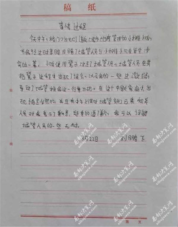 同時(shí),該回復(fù)還出現(xiàn)了學(xué)生和兩名執(zhí)法人員面對(duì)面的照片,在回復(fù)的最后有該學(xué)生手寫的事情過(guò)程。據(jù)該學(xué)生手寫過(guò)程稱,當(dāng)時(shí)學(xué)生親眼目睹了城管與小販發(fā)生沖突的一幕,既然是親眼目睹,為何會(huì)有視頻中的“隨便打人”一說(shuō)嗎?可想而知孩子在寫這份事情過(guò)程的時(shí)候是什么樣的心情。