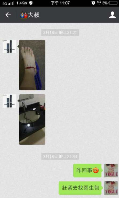 隨后,馬女士給本刊人員發(fā)來了她與老公的微信對話截圖和老公給她發(fā)來腳受傷的照片。通過微信截圖和照片顯示死者是在3月18日晚上21時(shí)21分受的傷,同衛(wèi)計(jì)局所說當(dāng)晚9時(shí)40多不到十點(diǎn)鐘的時(shí)間是相吻合的,但令人意想不到的是一個(gè)外傷竟然不到半小時(shí)就奪走了秦先生的性命。