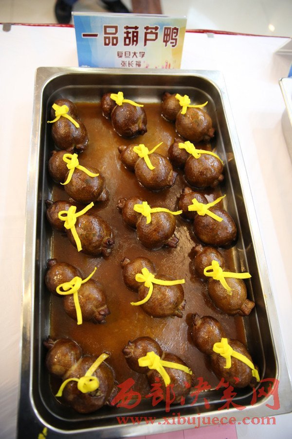 在長達(dá)數(shù)個(gè)小時(shí)的比賽中,來自37所上海高校的100多位廚師輪流上陣,共制作出菜品111個(gè)。圖為復(fù)旦大學(xué)一品葫蘆鴨。