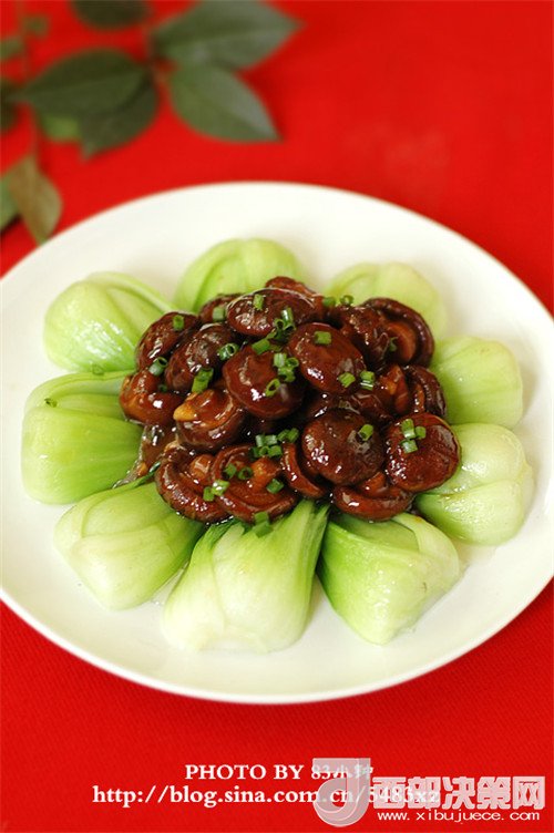 6.將燜好的香菇起鍋碼在菜心上,撒少許蔥花即可。