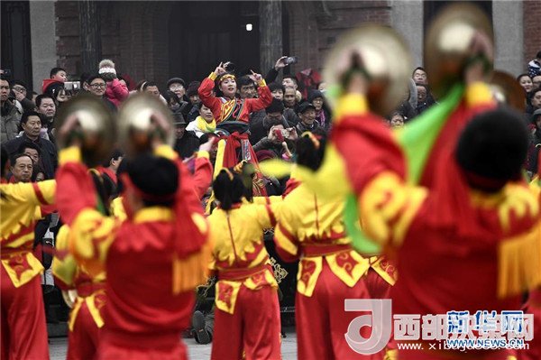 1月1日,在臺兒莊古城復(fù)興廣場,民間藝人在表演威風(fēng)鑼鼓。(記者 郭緒雷 攝)