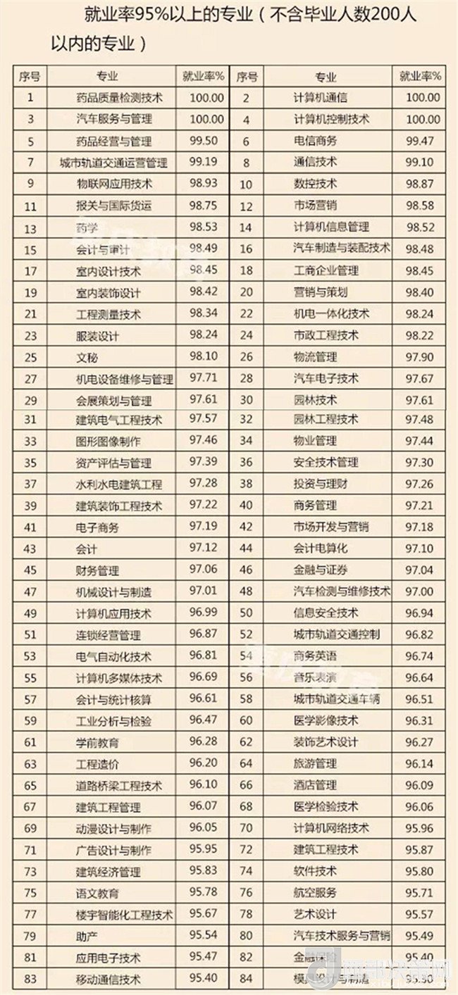 即將畢業(yè),你找到中意的工作了沒?近日,重慶市教委發(fā)布《重慶市2017屆普通高校畢業(yè)生就業(yè)情況報(bào)告》。據(jù)統(tǒng)計(jì),2017年,全市共有普通高校畢業(yè)生約21.49萬人,截至2017年8月31日,我市2017屆普通高校畢業(yè)生就業(yè)率為89.65%,與2016屆同比上升0.56%。記者了解到,控制工程專業(yè)、藥品質(zhì)量檢測(cè)技術(shù)、汽車服務(wù)與管理等專業(yè),其就業(yè)率達(dá)100%。哪個(gè)專業(yè)就業(yè)前景“低調(diào)卻奢華”?哪個(gè)專業(yè)只是“看上去很美”?趕緊往下看吧!