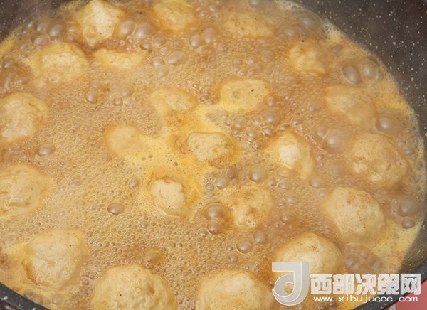 8、鍋中放入油,蒜末,洋蔥末爆香,加入魚蛋小炒一會(huì)兒。再放入水沒過魚丸,放入咖喱塊。