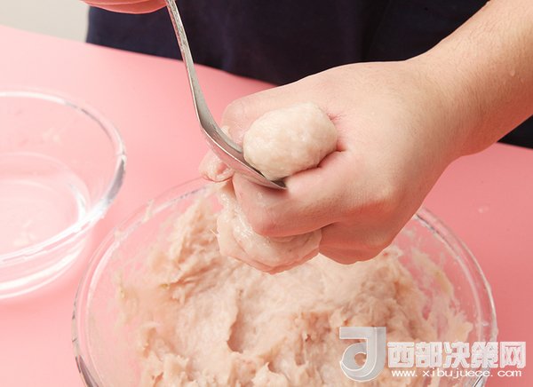 4、準(zhǔn)備一鍋冷水開始擠魚丸,拇指先在虎口處滑一下,把魚茸磨平,這樣擠出來的魚丸就會(huì)光滑。然后往上擠,用另一只手拿勺子接一下魚丸。