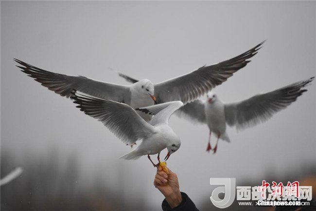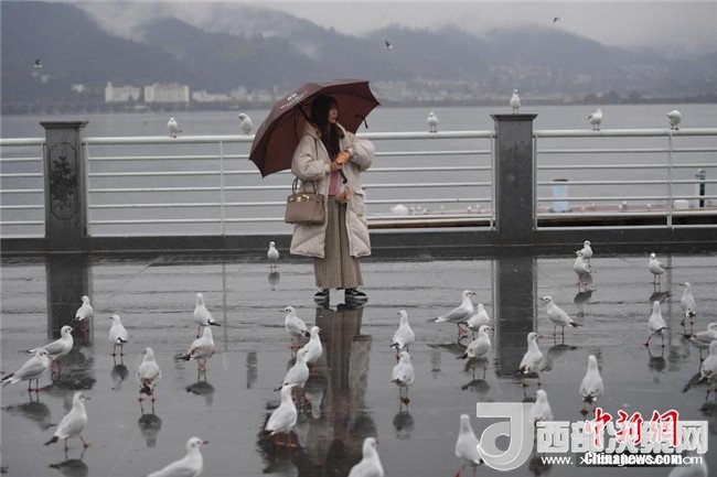 1月3日,紅嘴鷗在滇池邊與游客親密接觸。當(dāng)日,“春城”昆明淅淅瀝瀝的小雨下個不停,仍有眾多游客和市民來到滇池邊,與西伯利亞的“白色精靈”——紅嘴鷗相會,領(lǐng)略昆明別樣美景。(記者 劉冉陽 攝)