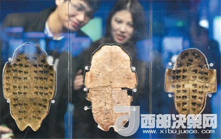 圖為游客在位于河南省安陽市的殷墟博物館中參觀刻有甲骨文的卜甲。(圖片來源新華社李嘉南 攝)