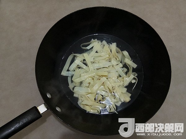5.焯過(guò)水的千張撈出放入盤(pán)中(用稍微有些深度的容器最好)
