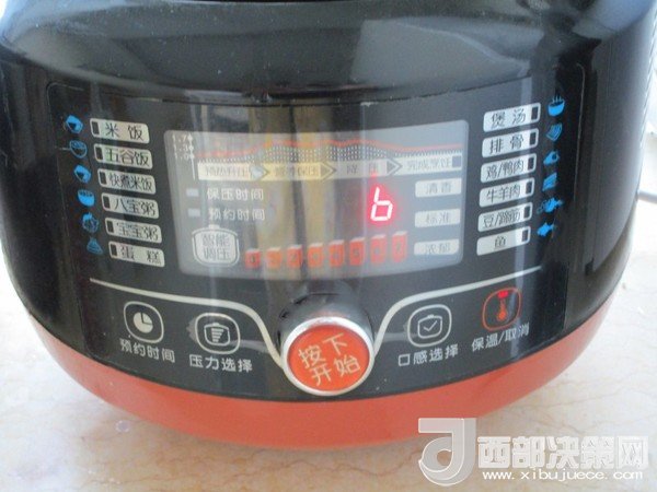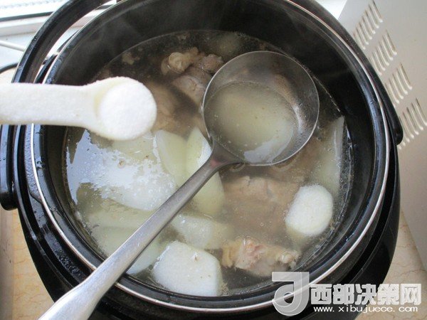 6.等時(shí)間到能打開后開蓋把白蘿卜加入,嘗試味道后加鹽調(diào)味,再壓5分鐘即可