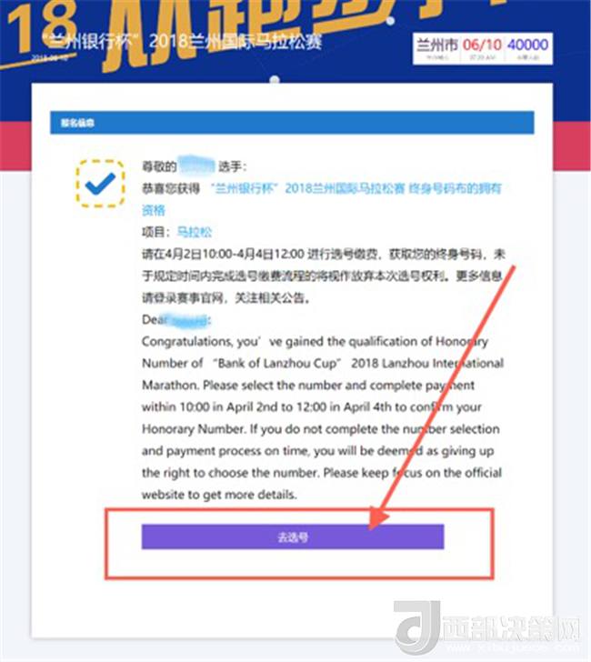 西部決策網(wǎng)—西部大開發(fā)訊(杜杰 帥華鋒)“蘭州銀行杯”2018蘭州國(guó)際馬拉松賽預(yù)報(bào)名工作已于3月25日15:00截止,現(xiàn)已全面進(jìn)入資質(zhì)審核階段,在所有成功預(yù)報(bào)名的選手中,終身號(hào)碼(含歷屆與2018新進(jìn))擁有者可于4月3日10:00-4月5日12:00通過官網(wǎng)完成自主選號(hào)并繳費(fèi);馬拉松項(xiàng)目直通選手(不含組委會(huì)特邀及專業(yè)運(yùn)動(dòng)員,詳見官網(wǎng)報(bào)名須知)也可于4月6日10:00-4月8日12:00完成自主選號(hào)并繳費(fèi)。具體規(guī)則及流程如下: