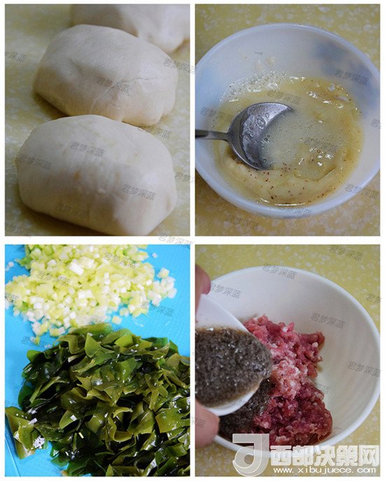 這款餅純屬亂搭型的,原來只是想自己練練手藝做個爬蝦醬味道的肉末餅,打開冰箱的時候發(fā)現(xiàn)有之前剩的新鮮裙帶菜,于是靈機一想,把裙帶菜也加入餅中,這樣讓這款餅更健康。
