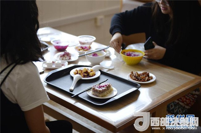 4月25日,兩名云南大學的研究生來到食堂體驗“玫瑰宴”。新華社發(fā)