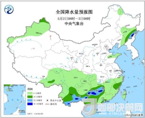 5月2日08時(shí)至3日08時(shí),吉林東部、湖南南部、貴州南部、廣西大部、云南南部等地的部分地區(qū)有中到大雨,其中,吉林東部、湖南南部、貴州東南部、廣西北部和西部、云南南部等地局地有暴雨(50~90毫米);上述局部地區(qū)將伴有短時(shí)強(qiáng)降水等強(qiáng)對流天氣。新疆北部和南疆盆地東部、內(nèi)蒙古中西部、遼東半島等地有4~6級風(fēng);新疆南疆盆地等地的部分地區(qū)有揚(yáng)沙或浮塵天氣(見圖1)。