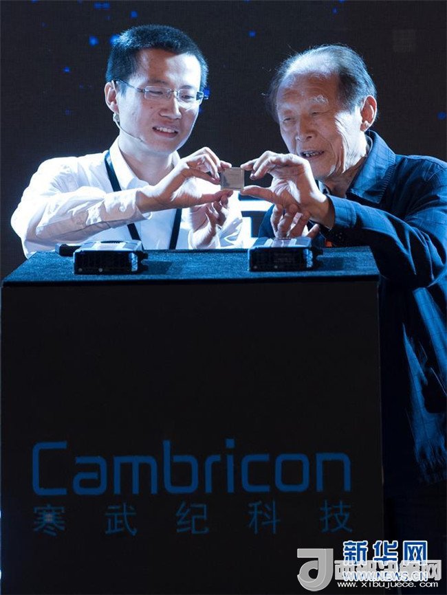 5月3日,在上海國際會(huì)議中心舉行的發(fā)布會(huì)上,寒武紀(jì)科技公司首席執(zhí)行官陳天石(左)和他的老師、中科院院士陳國良一起發(fā)布芯片。