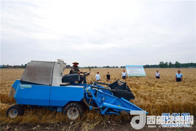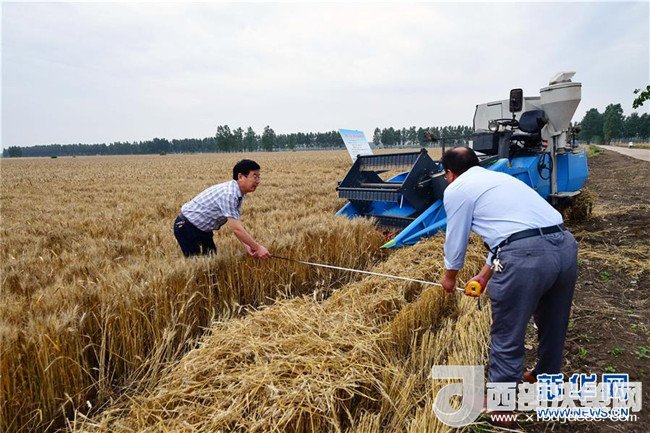 當(dāng)日,在河南省鄧州市腰店鎮(zhèn)國(guó)家雜交小麥項(xiàng)目制種基地,專家組對(duì)小麥進(jìn)行田間隨機(jī)多點(diǎn)取樣調(diào)查,收割機(jī)對(duì)小麥進(jìn)行實(shí)打?qū)嵤?。測(cè)產(chǎn)數(shù)據(jù)表明,雜交小麥種子生產(chǎn)在豐產(chǎn)性、抗逆性、抗病性、適應(yīng)性等方面表現(xiàn)優(yōu)異,標(biāo)志著我國(guó)雜交小麥研發(fā)進(jìn)入大田應(yīng)用和產(chǎn)業(yè)化階段。新華社記者 馮大鵬 攝