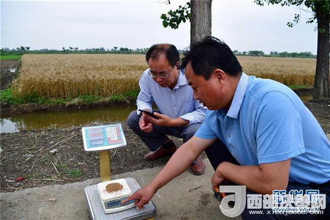 5月29日,在河南省鄧州市腰店鎮(zhèn)國(guó)家雜交小麥項(xiàng)目制種基地,工作人員將田間隨機(jī)多點(diǎn)取樣的小麥稱重。