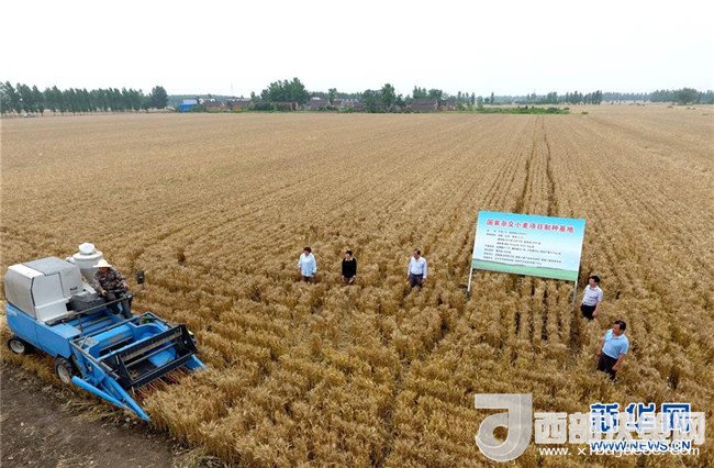 5月29日,在河南省鄧州市腰店鎮(zhèn)國(guó)家雜交小麥項(xiàng)目制種基地,收割機(jī)正在收割小麥。