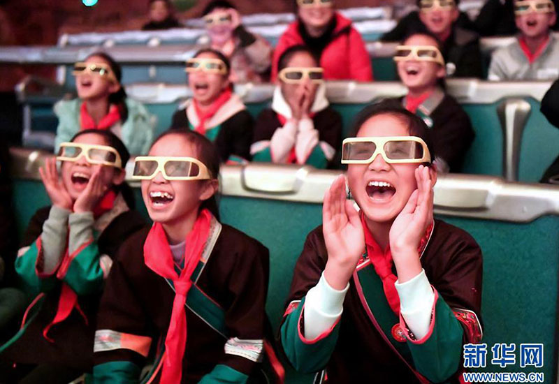 在廣西柳州市景行小學(xué)柳東校區(qū),來自三江侗族自治縣和融安縣大山里的留守兒童觀看3D動(dòng)畫片(1月4日攝)。當(dāng)日,柳州市舉行關(guān)愛留守兒童城市圓夢活動(dòng)。新華社發(fā)(黎寒池 攝)